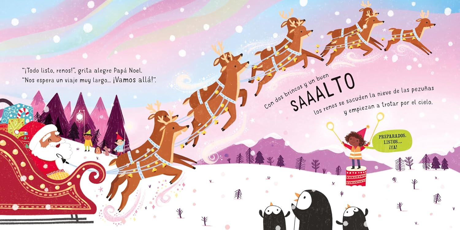 Este libro con lucecitas evoca la magia del viaje de Papá Noel en Nochebuena. La aventura empieza en el taller, donde los elfos le ayudan a terminar de cargar el trineo, que después saldrá volando por el cielo resplandeciente. Un libro para seguir a Papá Noel y sus renos en la noche más ajetreada del año.