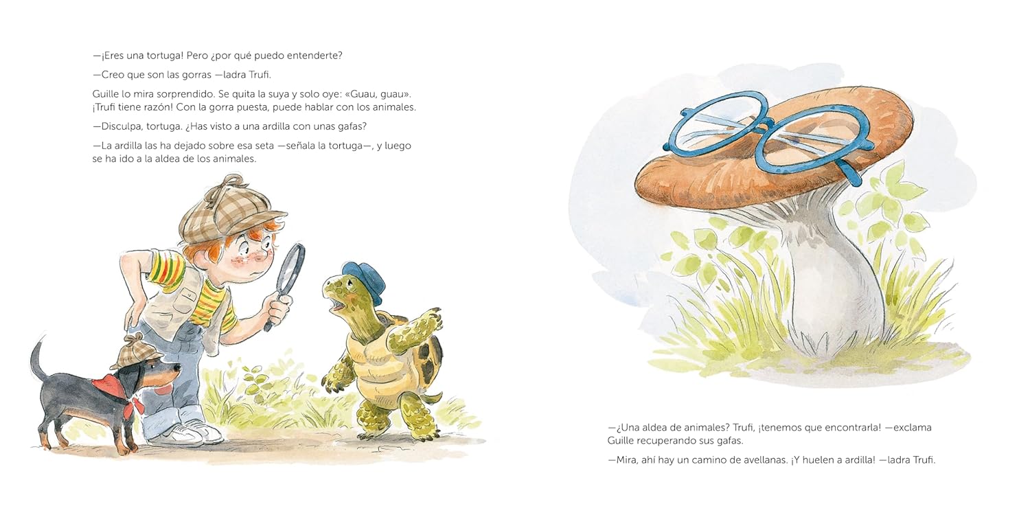 Paseando por el bosque, Guille y su perro Trufi encuentran un cofre misterioso con unas gorras de detective, un chaleco con muchos bolsillos y una lupa. Guille se lleva una buena sorpresa cuando descubre que, con la gorra puesta, es capaz de entender lo que dicen los animales del bosque. Qué suerte, porque en la aldea de los animales necesitan urgentemente un detective: ¡ha desaparecido un huevo de Pata!