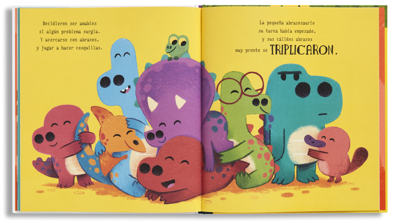 La pequeña abrazosaurio se encuentra ante un dilema: ¿Cómo va a conseguir que sus amigos dejen de discutir, rugir y pelearse? Está dispuesta a intentarlo todo. Su madre siempre le dice que los abrazos son la mejor solución. ¿Logrará que todo vuelva a la calma?