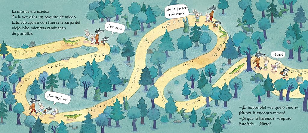 Estofado, Lobo y Tortilla están dando un paseo cuando escuchan a lo lejos una preciosa canción. Suena tan bien, que siguen la melodía hasta llegar a un claro repleto de árboles con forma de animales.