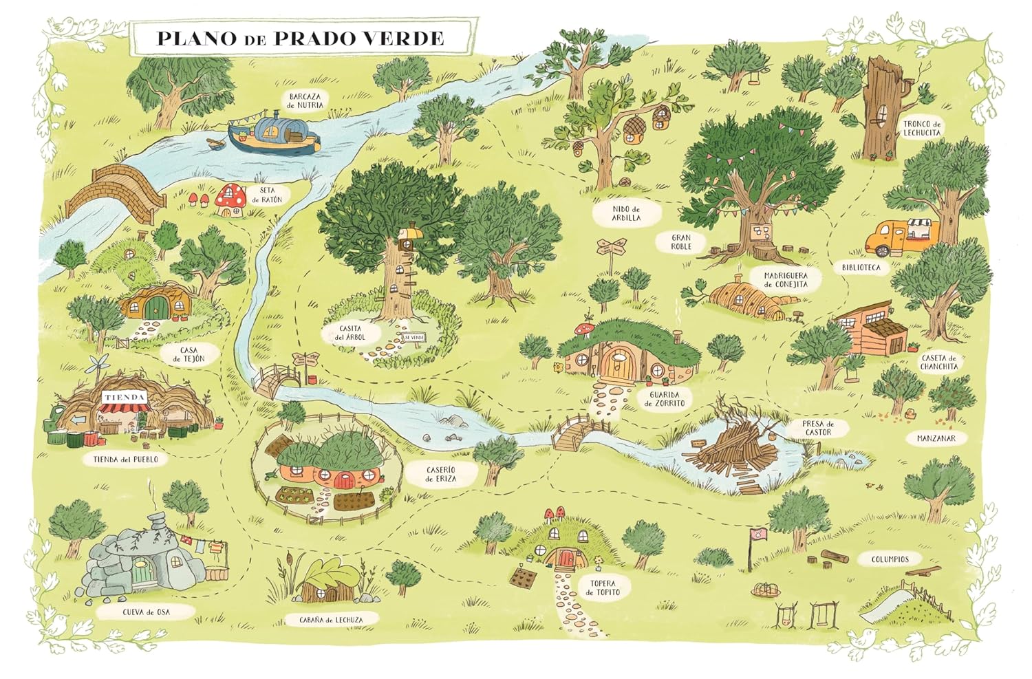 Bienvenidos a la aldea de Prado Verde, un mundo cálido y acogedor donde sus habitantes buscan vivir en armonía y ayudarse siempre. Una colección de ocho historias gentiles para aprender a (con)vivir y que siempre terminan con un abrazo.